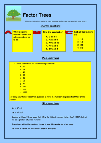 Factor Trees - GCSE Maths - Steps, Examples & Worksheet Factor trees are a way of expressing the factors of a number, specifically the prime factorization of a number. ... Each branch in the tree is split into factors.